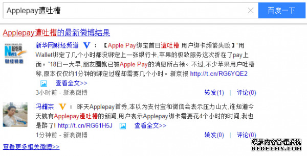 微博更適合做熱點事件推廣或營銷,比如今天有新聞報道Applepay遭吐槽的事件,我馬上上微博發了一條微博內容,并且附上了我的報道鏈接,2分鐘后排名上了首頁,而這個關鍵詞的搜索熱度是60多萬,1個小時左右,這條微博已經為我的文章引流4000多IP了。